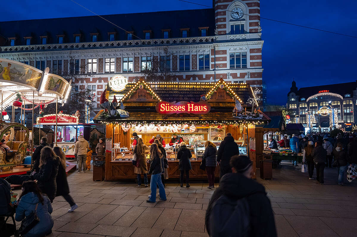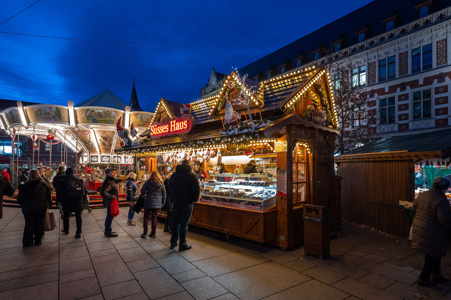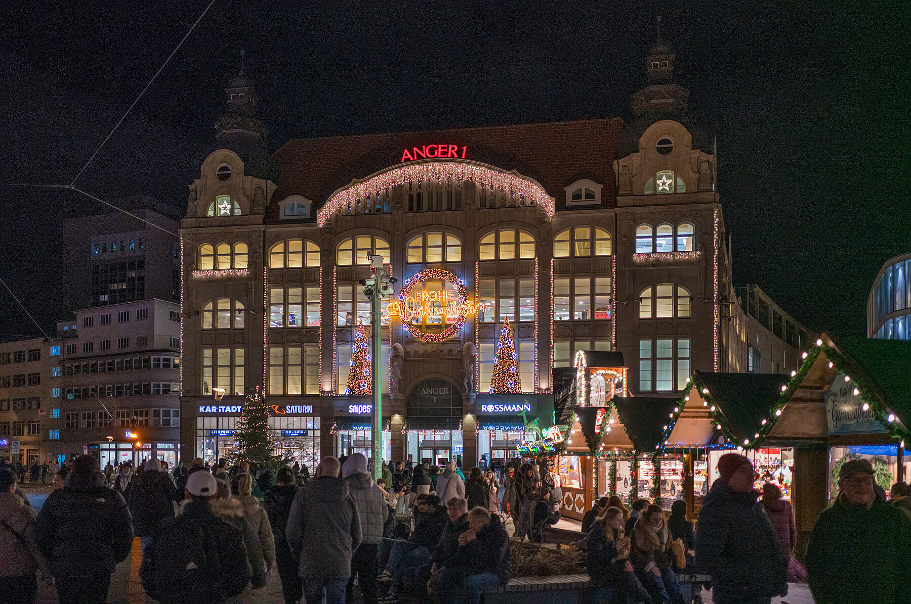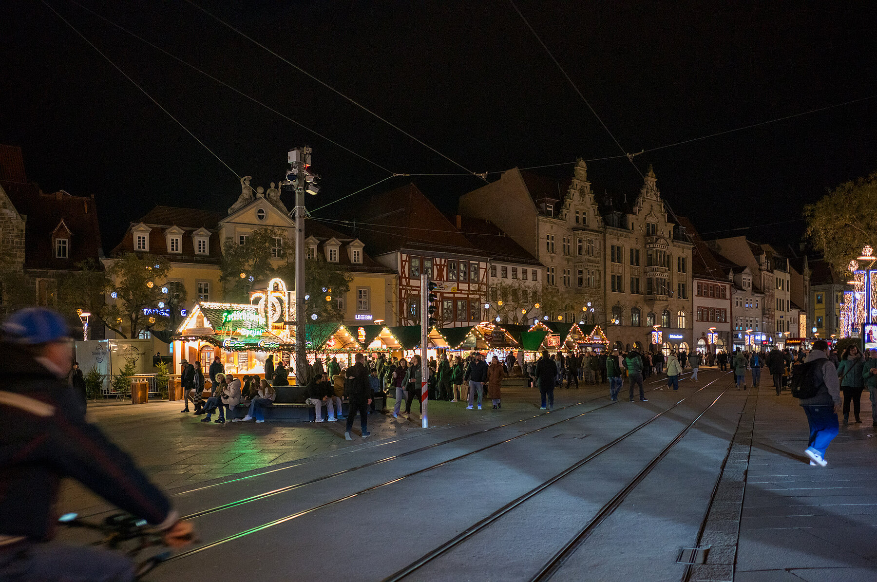 Die Erfurter Innenstadt ist in weihnachtliches Licht getaucht. Von der Bahnhofstraße bis zur Glockenquergasse, vom Anger bis zum Domplatz, von der Schlösserstraße über die Krämerbrücke bis zur Rathausbrücke und hinauf zum Petersberg – überall findet man festlich geschmückte Stände und Attraktionen.